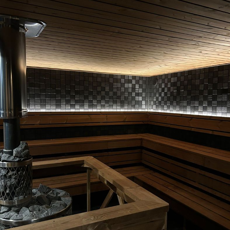 Step inside this one-of-a-kind sauna and you’ll be wrapped in pure luxury. The lavish thermo-treated timber interior radiates warmth, paired with deep black textured wall tiles for that modern, boutique-spa feel.